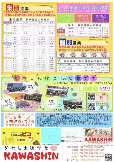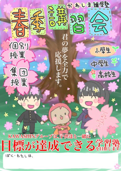 かわしま進学塾では、春季講習会を好評受付中です!!春の復習はぜひかわしんで!
