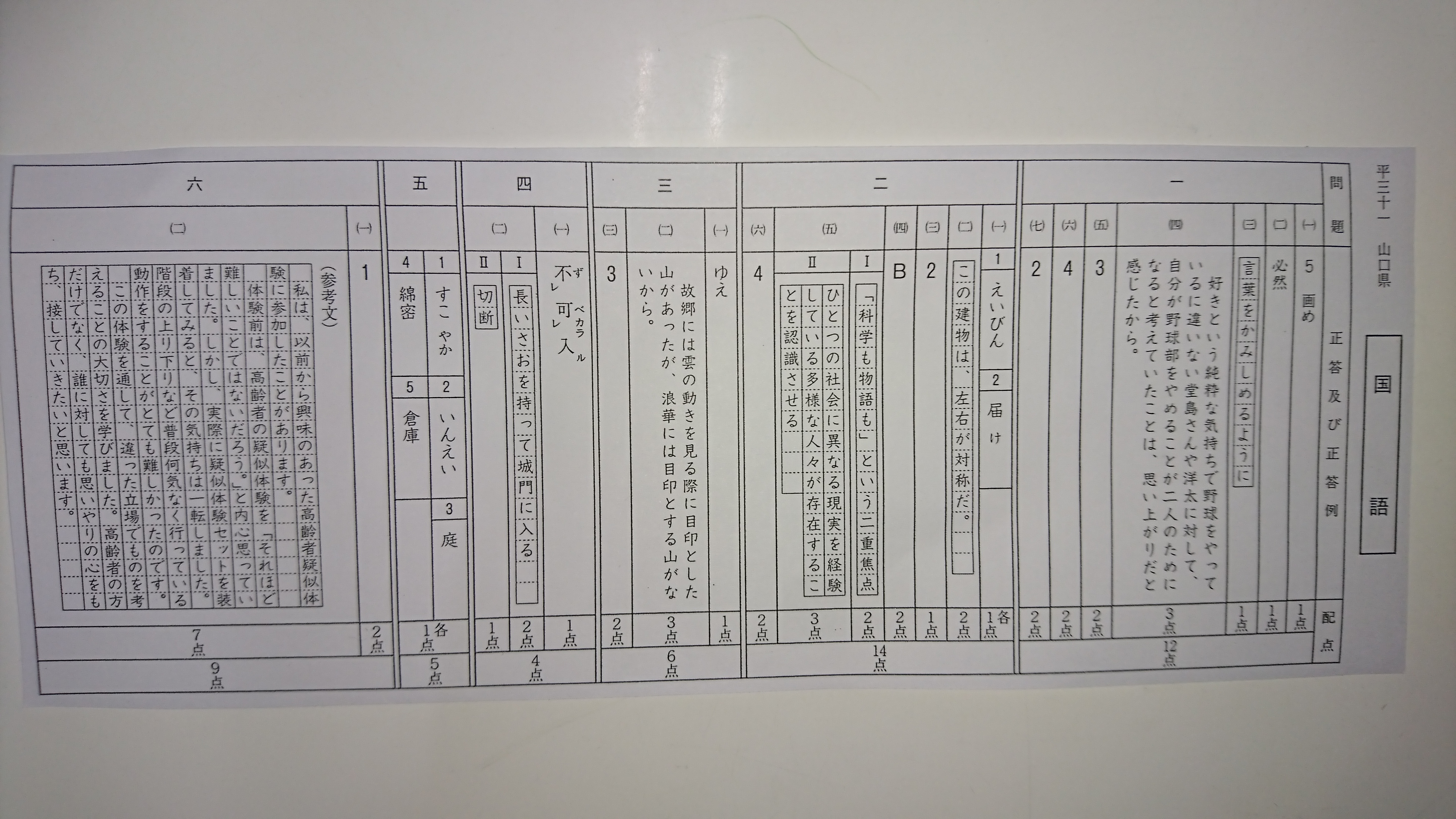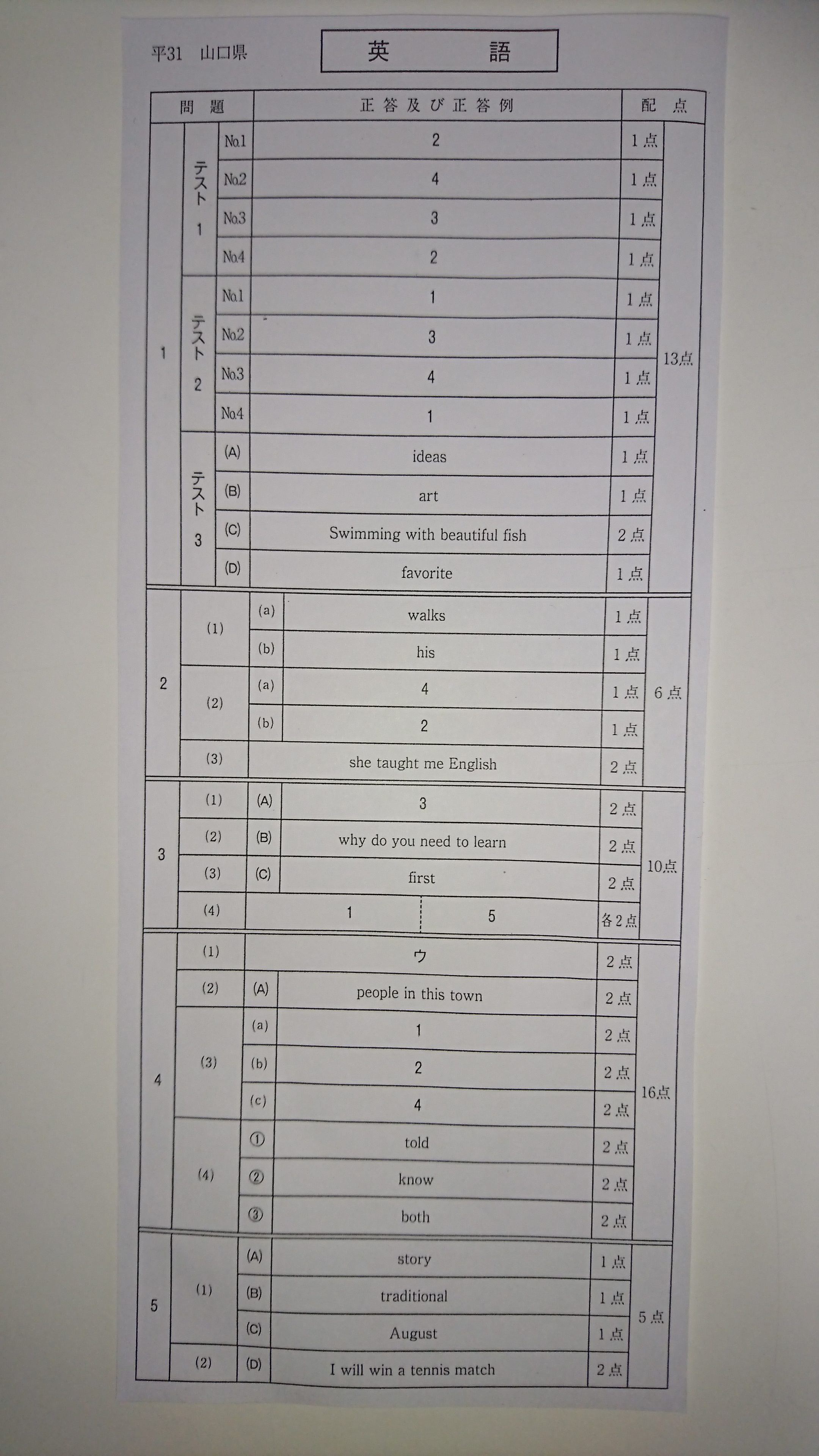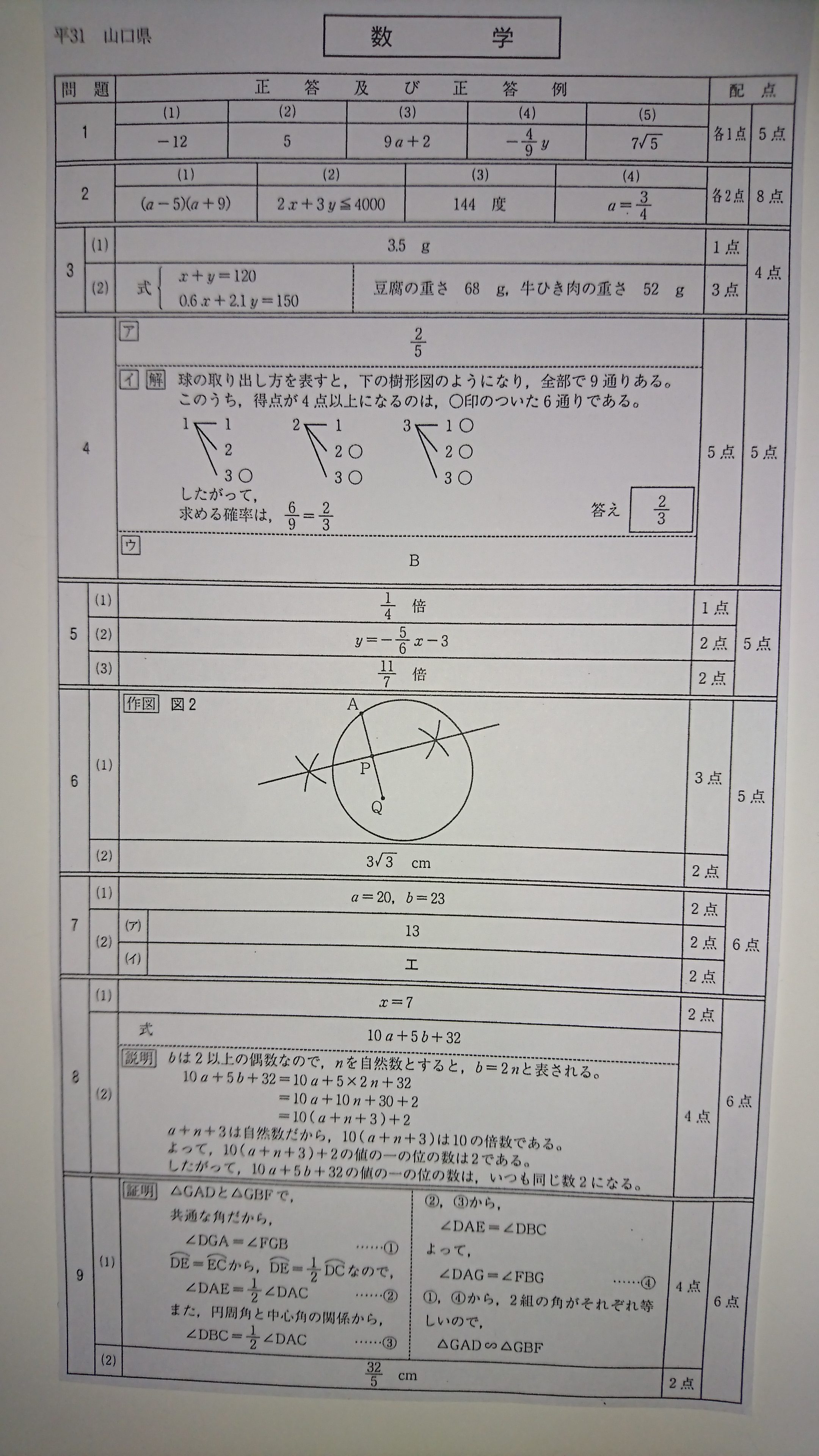 平成31年度山口県公立高校入試 学力検査問題(解答と配点)