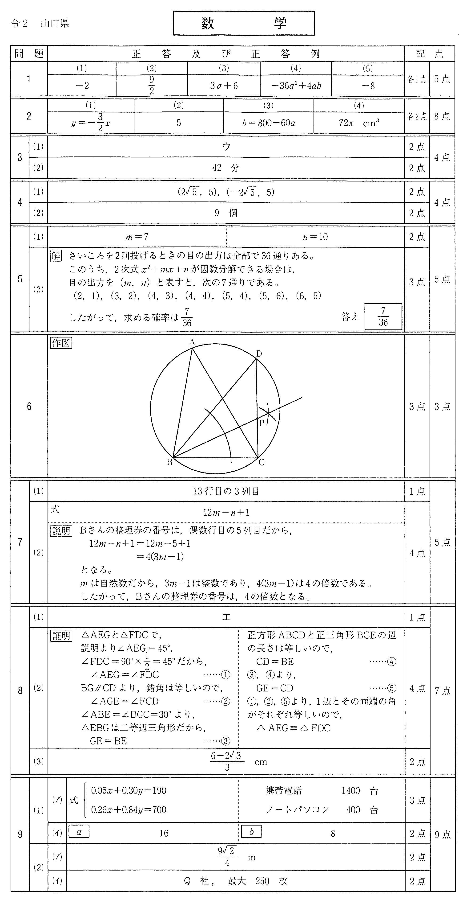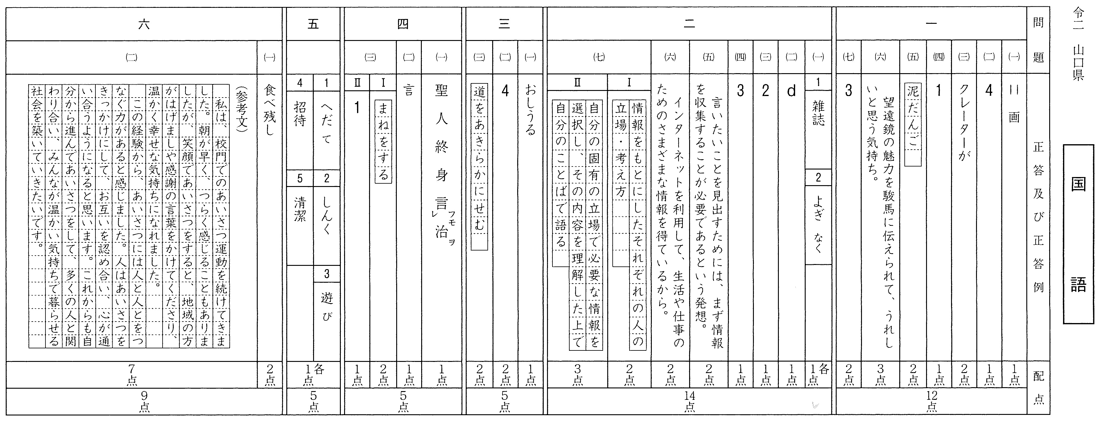令和2年度山口県公立高校入試 学力検査問題(解答と配点)