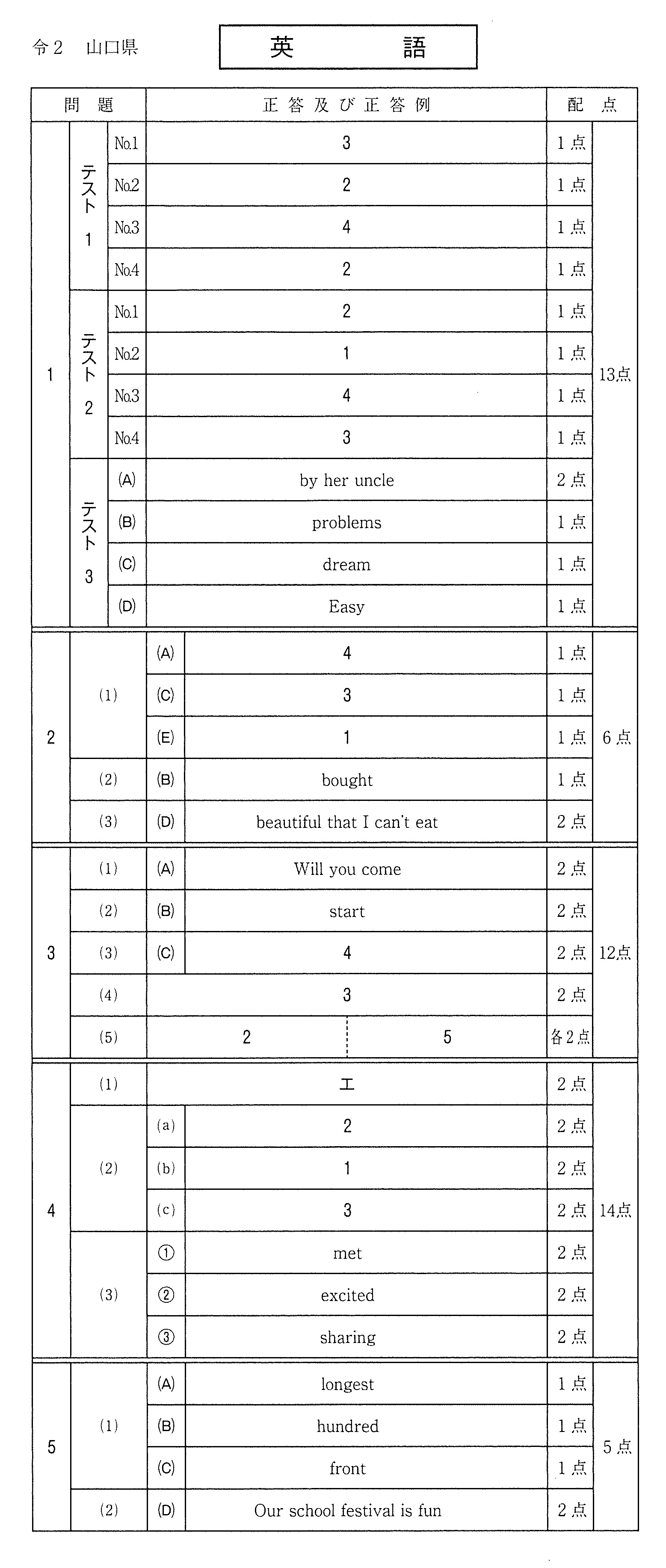 3時間目 英語(解答と配点)