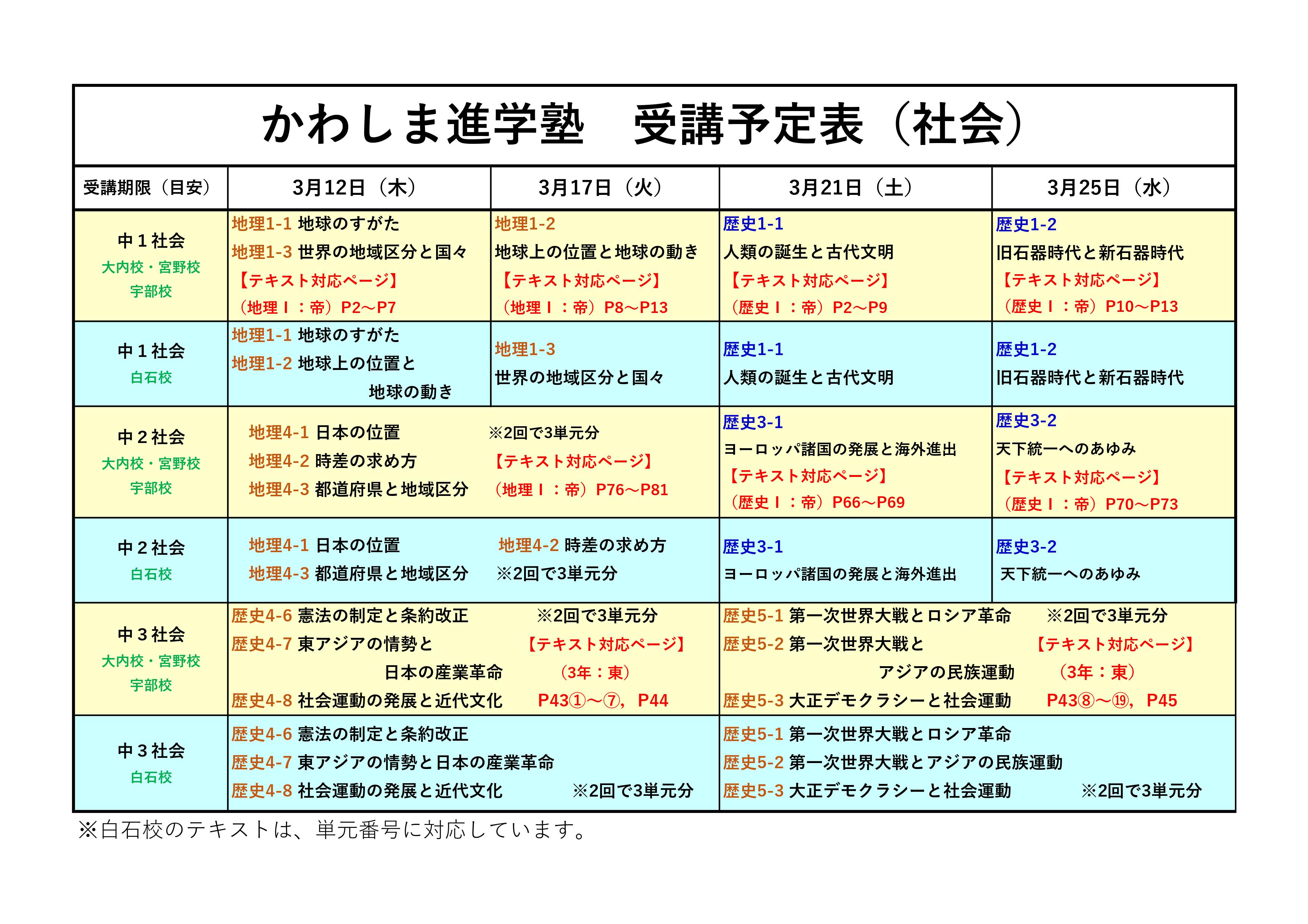 以下の学年・校舎ごとの受講予定に従って受講を進めてください。授業を受講した後は、必ずテキストの問題演習を行ってください。問題演習の答えはテキストではなく、必ずノートに解きましょう。テキストの問題演習を行ったノートは、春季講習会初日に提出してください。(画像をクリックすると拡大します。)この機会にしっかりと授業を進めて、学力UPにつなげていきましょうね!!