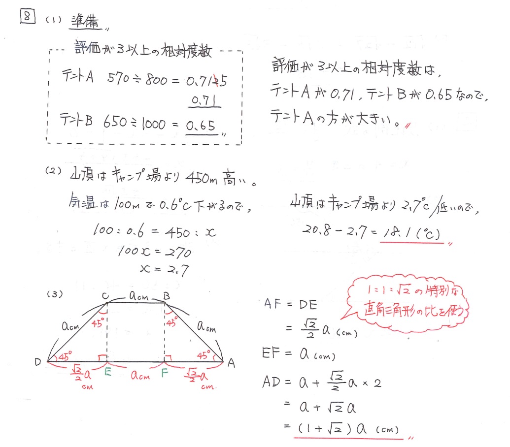(1)では頻出の「相対度数」が出題。相対度数を計算してうまく説明しましょう。