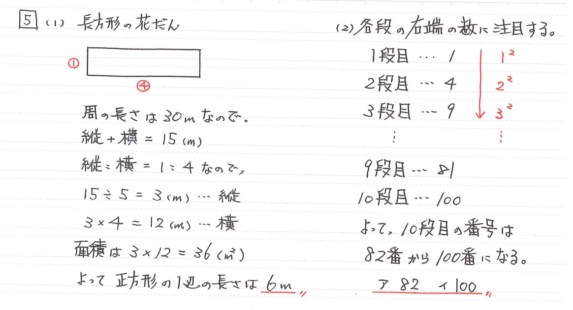 (1) は比から長方形の縦と横の長さを求めることができれば答えはすぐそこです。(2) は◯段目といちばん右端の平方数(2乗の数)の関係に着目しよう。n 段目の右端の数は n の2乗になることを使って解きます。