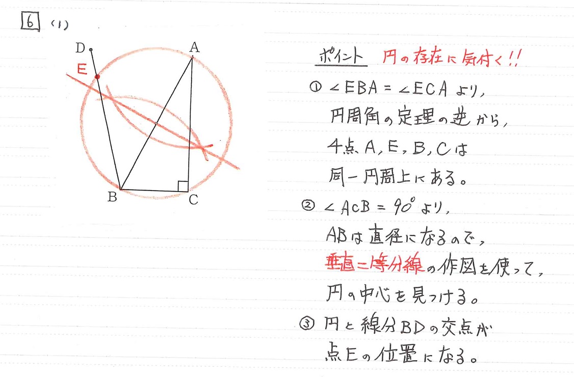 (1) は【円周角の定理の逆】に気づくことができるかがポイントです。出題の単元は異なりますが、去年に続いて【円周角の定理の逆】の出題でした。