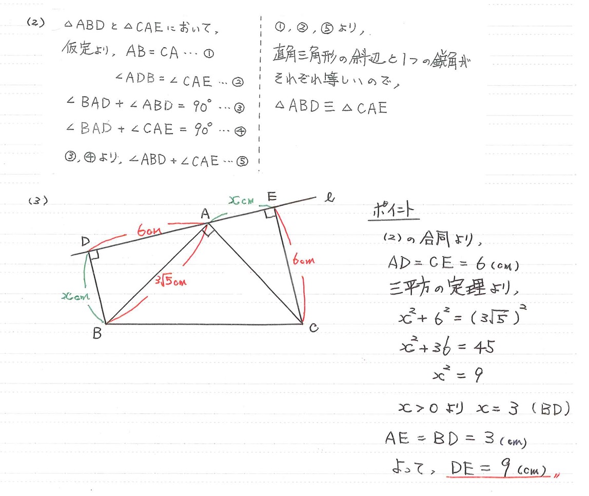 (2) は直角二等辺三角形の【三段論法】を使ったよく見かけるタイプの合同の証明でした。今年の証明は合同&円が出ると予想していましたが、ここは見事にハズれました。