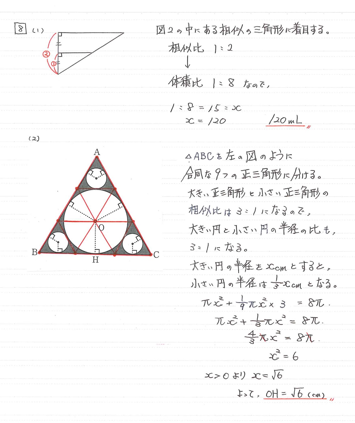 (3) は三平方の定理を使うと意外とすらっと解けます。例年、難問が出やすい場所なので、敬遠した受験生もいたかもしれませんが今年は標準レベルの難易度でした。